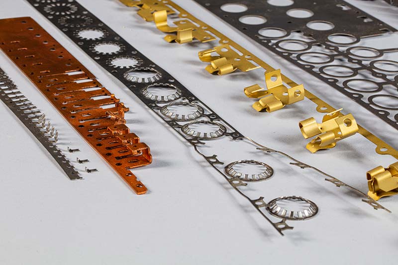 Kleinere Bauteile, wo mehrere Arbeitsphasen notwendig sind (wie z.B. beim Biegen oder Bohren), um sich in das Endprodukt umzuwandeln, werden durch Montage von progressiven Matrizen auf mechanischen Pressen hergestellt. Diese Art von Form sieht eine Reihe von Schritten vor, die das Blech selektiv verformen. Bei jedem Pressschritt ändert die progressive Form das Ergebnis der vorherigen Phasen, indem das Blech geschnitten, gebogen oder gebohrt wird.